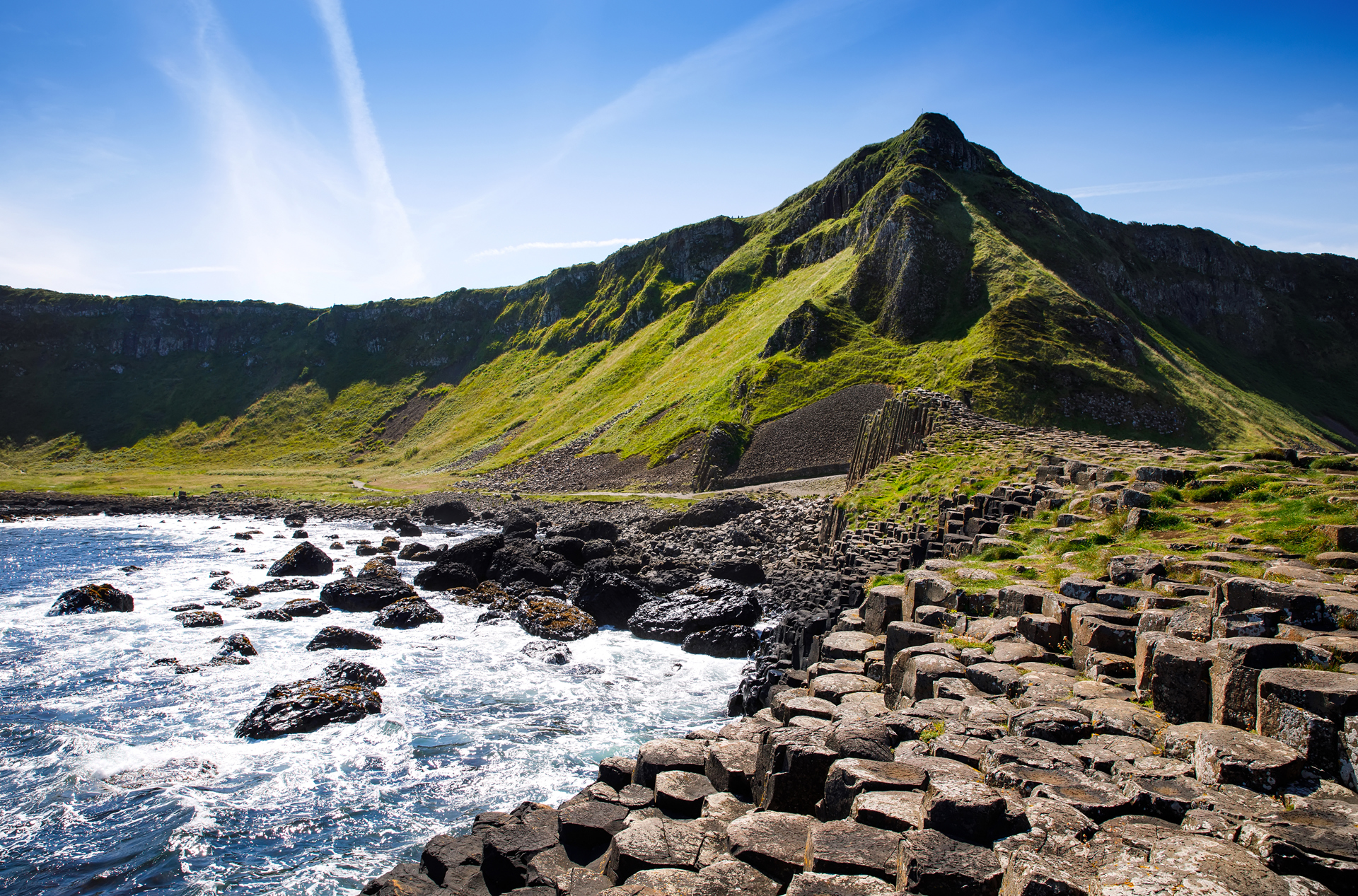 Mod nord strækker de dramatiske kyststrækninger sig og består af forrevne klipper og det særegne Giant's Causeway. Her springer tusindvis af sekskantede stensøjler i øjnene - et mildest talt eventyrligt fænomen.